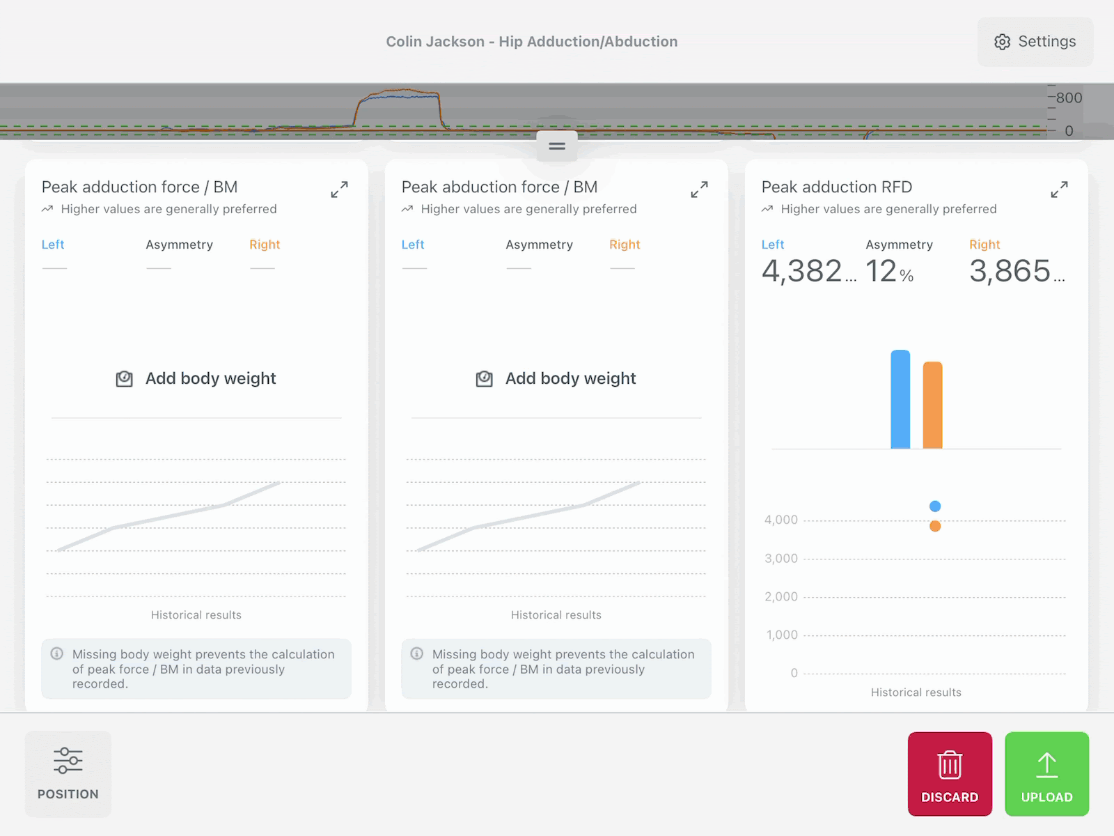 По умолчанию данные о массе тела берутся из профиля пользователя в VALD Hub, но их легко изменить в разделе: